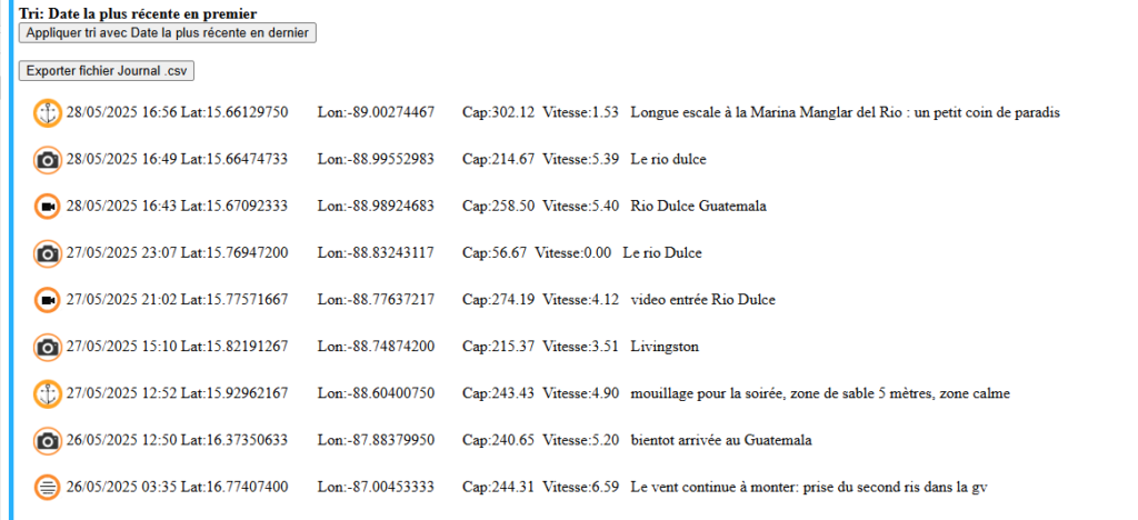 Le mode Journal avec possibilité de tris et exportation en .csv pour tableur et donc exploitation dans d’autres logiciels. Lien exemple